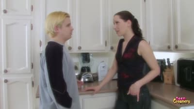 This blonde teen guy has a great time as he gets to fuck a sexy brunette milf who can't wait to get his spunk