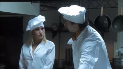 She's telling the story of a young cooker feeling horny in her restaurant kitchen fucking a lesbian girls and enjoying fucking her on the table