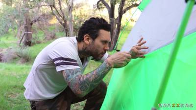 She went searching for woods when she saw a horny girl masturbating in tent decided to joing her and get fucked there by the tent owner