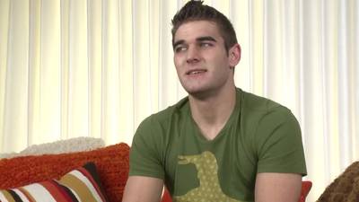 Brenden takes his dick out of his boxers and jerks off in the sofa until he ejaculates all over his chest.