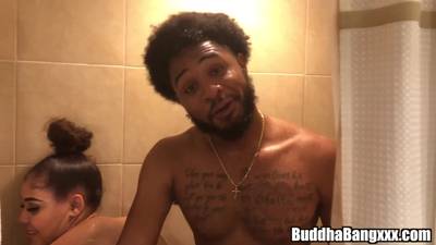 This black slut with big tits and a fatass sucks a guy's big black cock to get him hard, because she is going to ride him passionately!