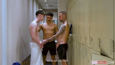After a soccer game, these teens get together in a locker room and make the blonde get down on his knees to suck them both!