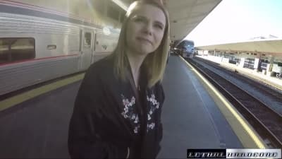 Perky blonde gets taken into the first class carriage of the train. In this private space, she can get down and dirty with her fellow traveller